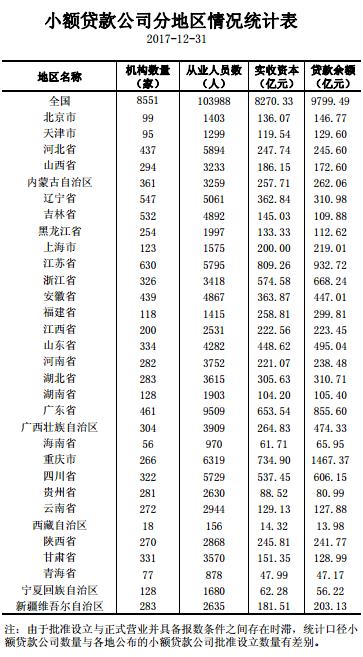 截至2017年末,全国共有小额贷款公司8551家。贷款余额9799亿元,全年增加504亿元。