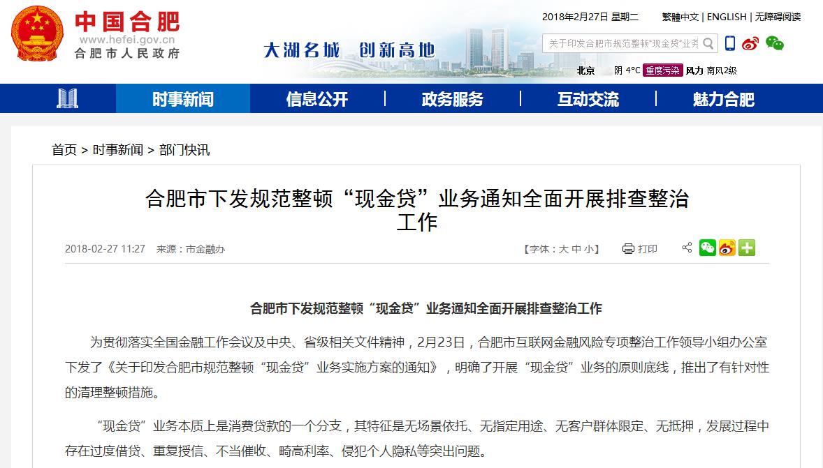 2月27日,合肥市政府官网发布消息称,合肥市下发规范整顿"现金贷"业务通知,全面开展排查整治工作。