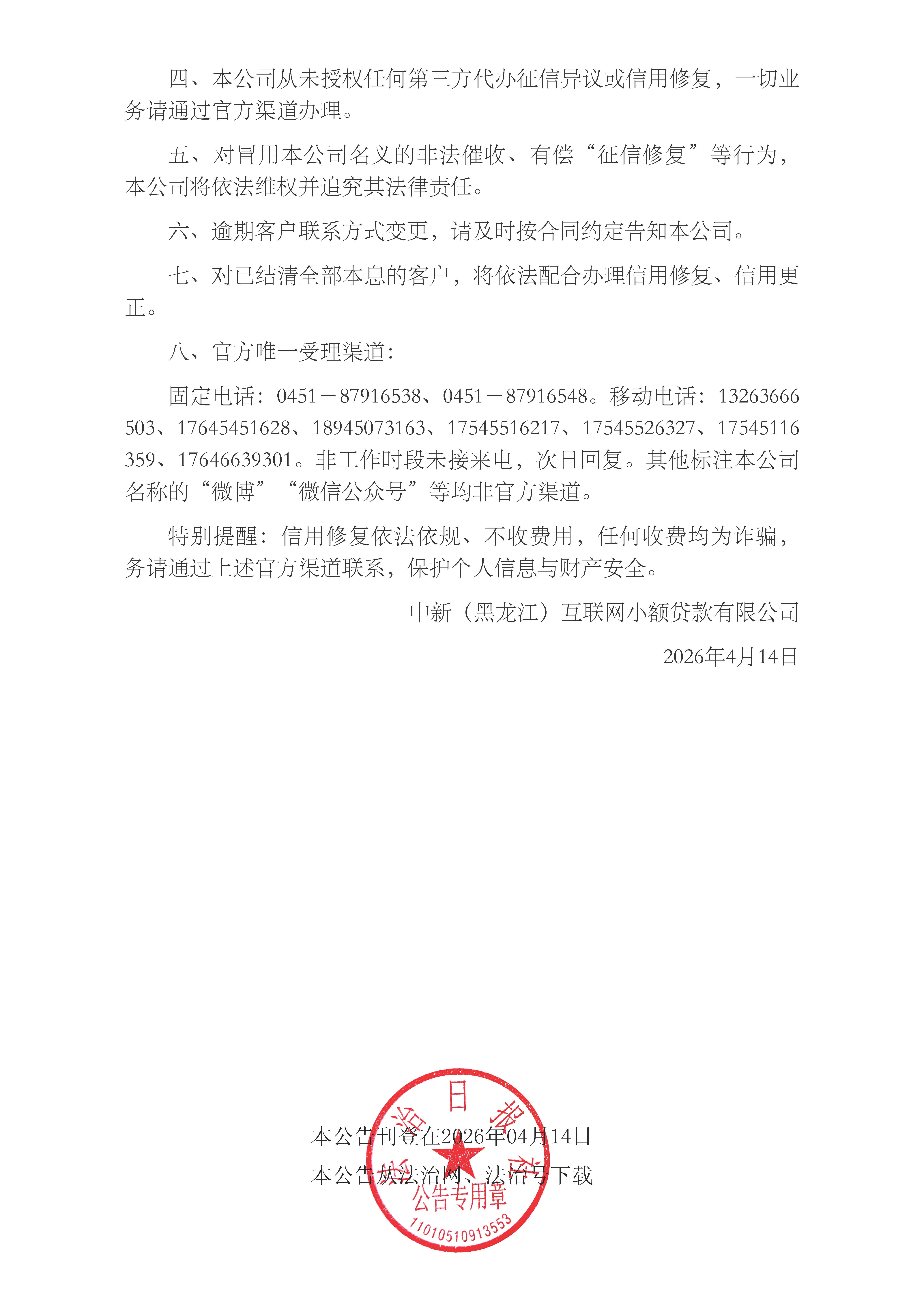 【转发机构公告】中新(黑龙江)互联网小额贷款有限公司公告