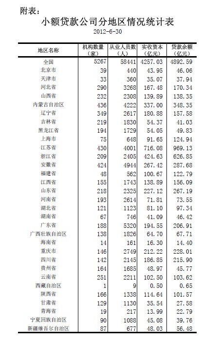7月30日电 据央行网站消息,2012年上半年小额贷款公司数据统计报告30日对外发布,截至2012年6月末,全国共有小额贷款公司5267家,贷款余额4893亿元,上半年新增贷款977亿元。