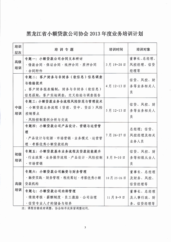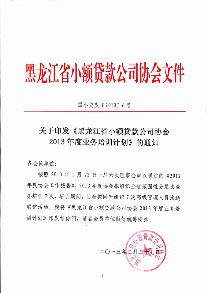 关于印发《协会2013年度业务培训计划》的通知(黑小贷发[2013]6号)