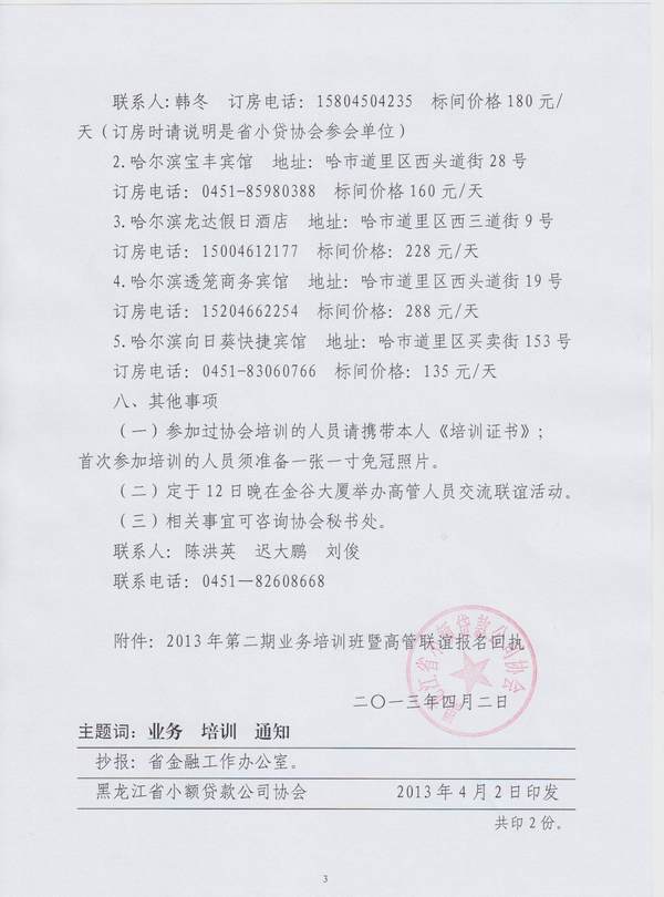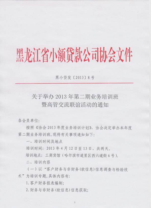 关于举办2013年第二期业务培训班暨高管交流联谊活动的通知(黑小贷发[2013]8号)