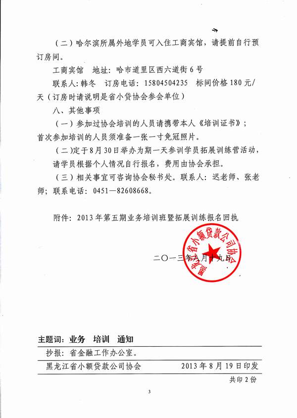 关于举办2013年第五期业务培训班暨拓展训练活动的通知(黑小贷发[2013]18号)