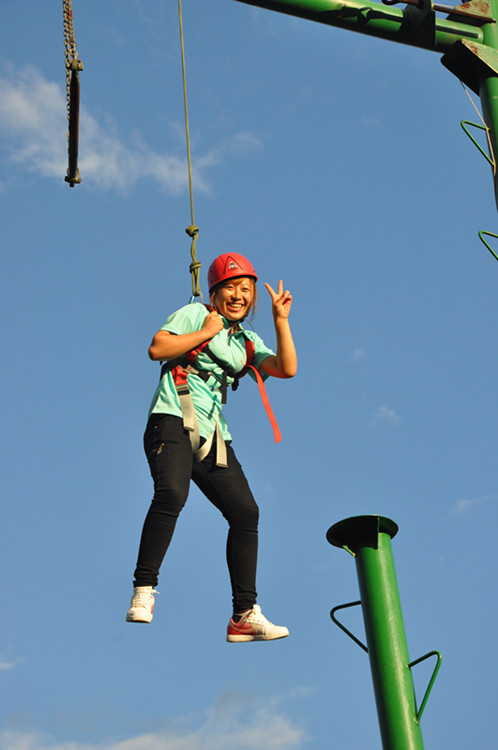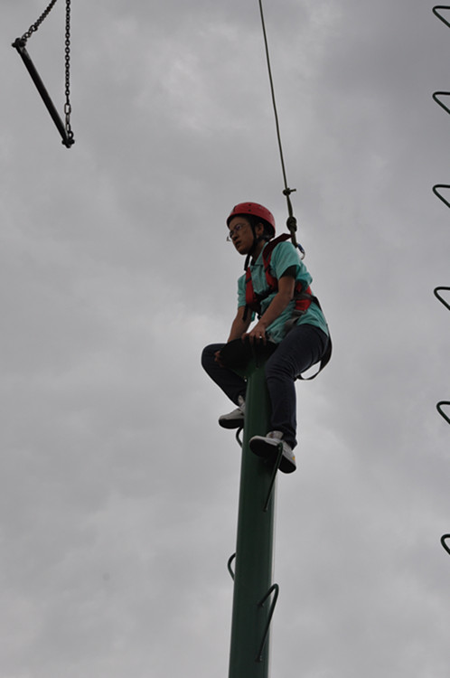 下午的训练项目为"空中断桥"和"空中抓杠",属于个人挑战项目。空中断桥要求队员在有安全保护的情况下,爬上断桥,在空中做两次跨步跳,先跳过去,在桥上转身再跳回来。空中抓杠项目也是要先爬到高空中,站在只能放下双脚的托盘上,起身跳跃,抓住横杠才算完成动作。这两个项目对学员的个人心理都是很大的挑战。两队学员分别在教练的带领下完成二个项目,"亮剑队"学员先完成空中抓杠项目,"鹏程队"则先做空中断桥,然后两队项目互换。在各队学员的鼓励下,学员们一个接一个爬向高空,是恐惧?是期待?是刺激?还是……一时也无法用语言形容出大家此时复杂的心情。正当他们快到达目标时又犹豫了:我能行吗?我是否能做到?会不会失败啊?做还是不做?……这时怀疑和恐惧一次次涌上心头。在队员们互相的鼓励下和教练对动作要领的重复指导下,我们的学员终于在最后时刻战胜了自己,战胜了心理的恐惧,勇敢的跨出了那一步,我们胜利啦!大家的脸上绽放出成功的喜悦,队员们为自己的队友喝彩、鼓掌、欢呼,还有的立刻用相机拍下这惊心动魄的瞬间,与家人和朋友分享成功的喜悦。