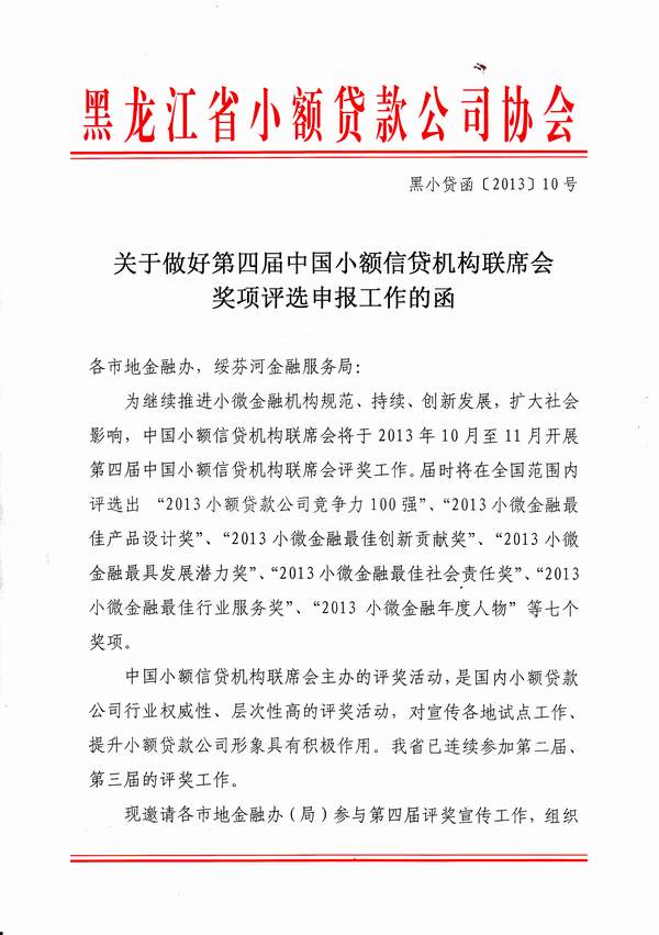 关于做好第四届中国小额信贷机构联席会奖项评选申报工作的函(黑小贷函[2013]10号)