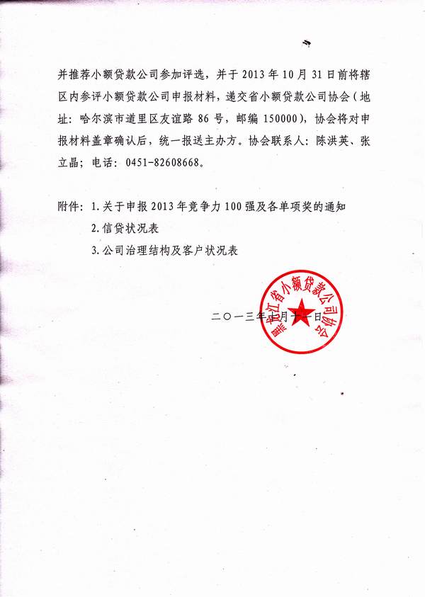 附件1:关于申报2013小额贷款公司竞争力100强及各单项奖的通知.doc