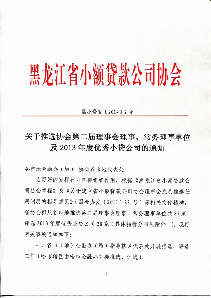关于推选协会第二届理事会理事、常务理事单位及2013年度优秀小贷公司的通知