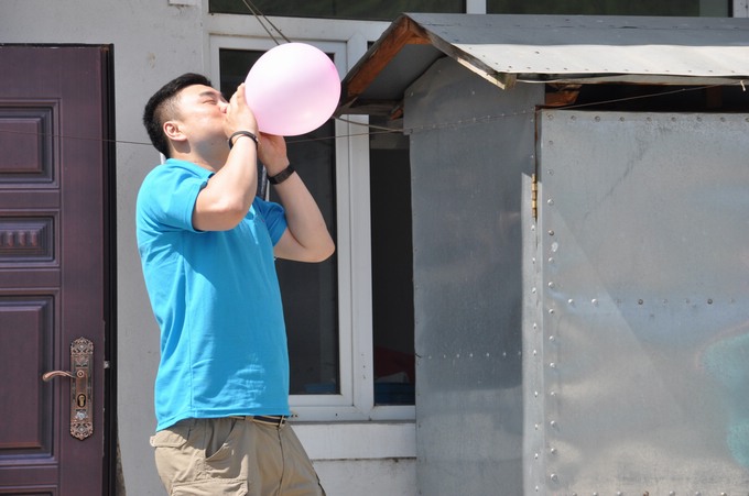 (图为游戏活动现场,参赛选手卖力吹破气球)