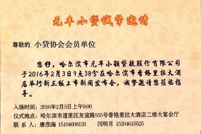 哈尔滨元丰小贷公司新三板上市庆典邀请函