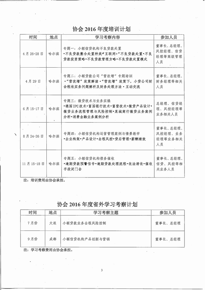 协会2016年度培训、考察计划