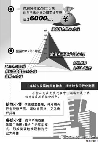 行业数据显示,自2008年试点9年以来,山东全省小贷公司累计放贷超过6000亿元。截至2017年5月底,全省424家小贷公司注册资本共574亿元,贷款余额为581.4亿元。2017年1至5月,小贷公司累计发放贷款270亿元,缴税3.4亿元。
