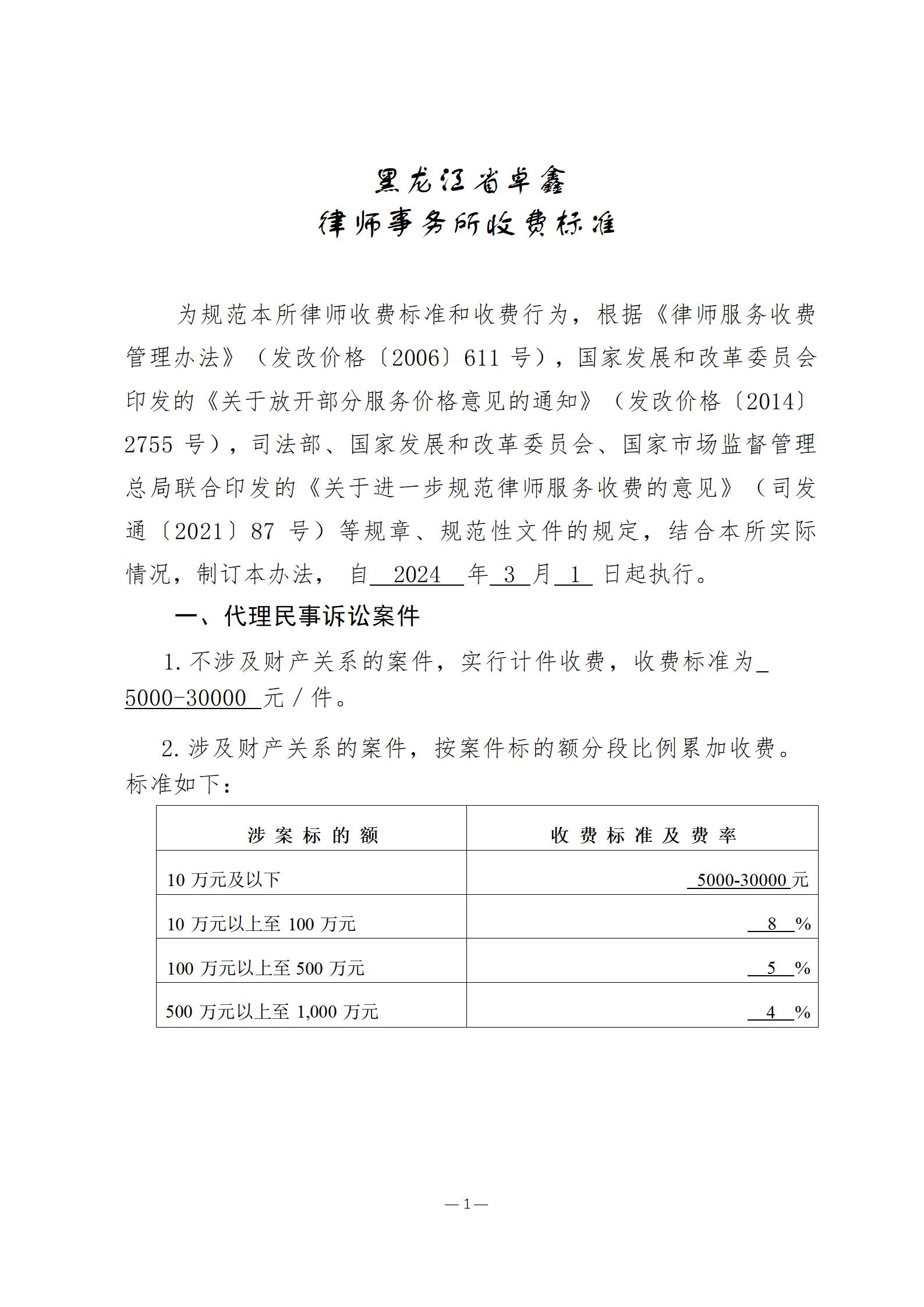 针对本所会员客户,将按照本所经公示的《黑龙江卓鑫律师事务所收费标准》的 50% 收取服务费用。该优惠政策覆盖多项基础法律服务(特殊复杂案件需结合实际情况另行协商),既能切实降低会员客户的法律成本,也能让会员在享受专业法律服务时获得更高性价比,充分体现本所对长期合作客户的回馈与支持。