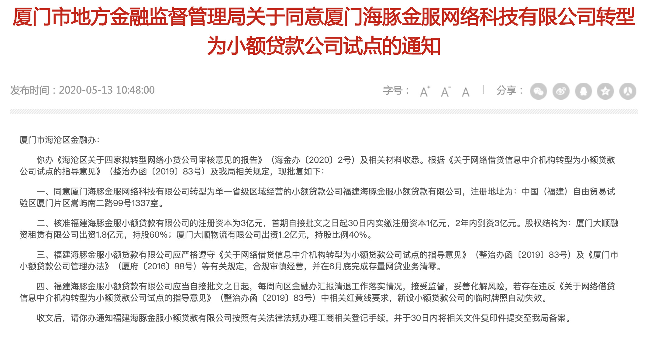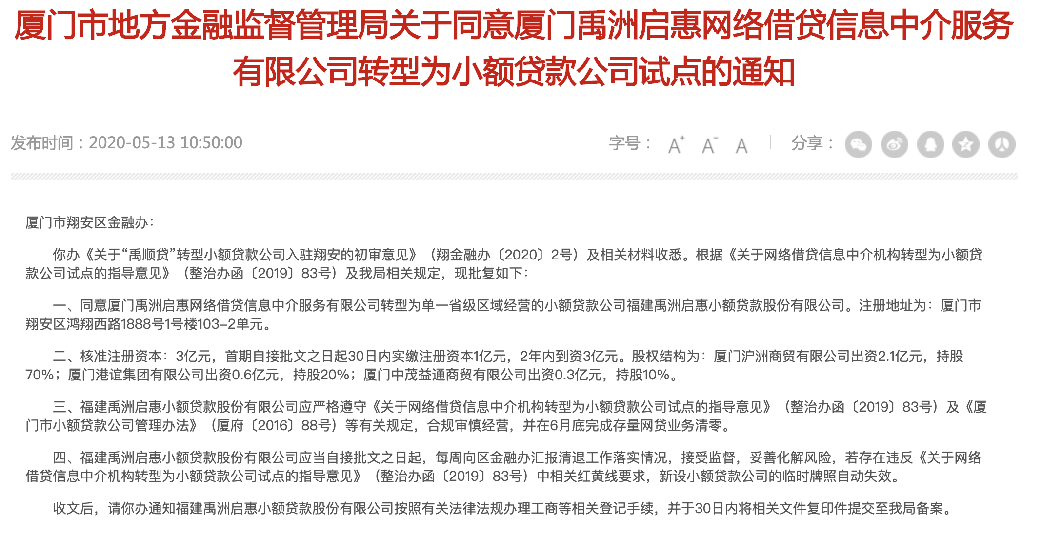 5月13日,厦门市地方金融监督管理局官网发布两则网贷公司转型为小额贷款公司试点的《通知》。其中,两家公司分别为厦门禹洲启惠网络借贷信息中介服务有限公司(下称"禹洲启惠")、厦门海豚金服网络科技有限公司(下称"海豚金服")。