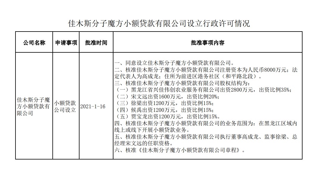 近日,省地方金融监督管理局网站公告显示,2021年1月16日批准佳木斯分子魔方小额贷款有限公司设立,自此佳木斯市分子魔方小贷公司成为新年第一家新设立的小贷公司,也是省内第一家可以在全省范围内从事线上和线下业务的小贷企业。热烈祝贺,佳木斯市分子魔方小额贷款有限公司的设立经营!