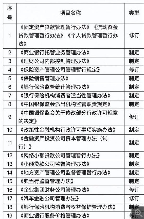 《立法计划》共提出制定或修订规章制度19项。其中包括《商业银行托管业务管理办法》、《保险销售管理办法》、《网络小额贷款公司管理暂行办法》、《小额贷款公司监督管理办法》、《银行保险机构消费者权益保护管理办法》等13项内容,修订《个人贷款管理暂行办法》《汽车金融公司管理办法》等6项内容。