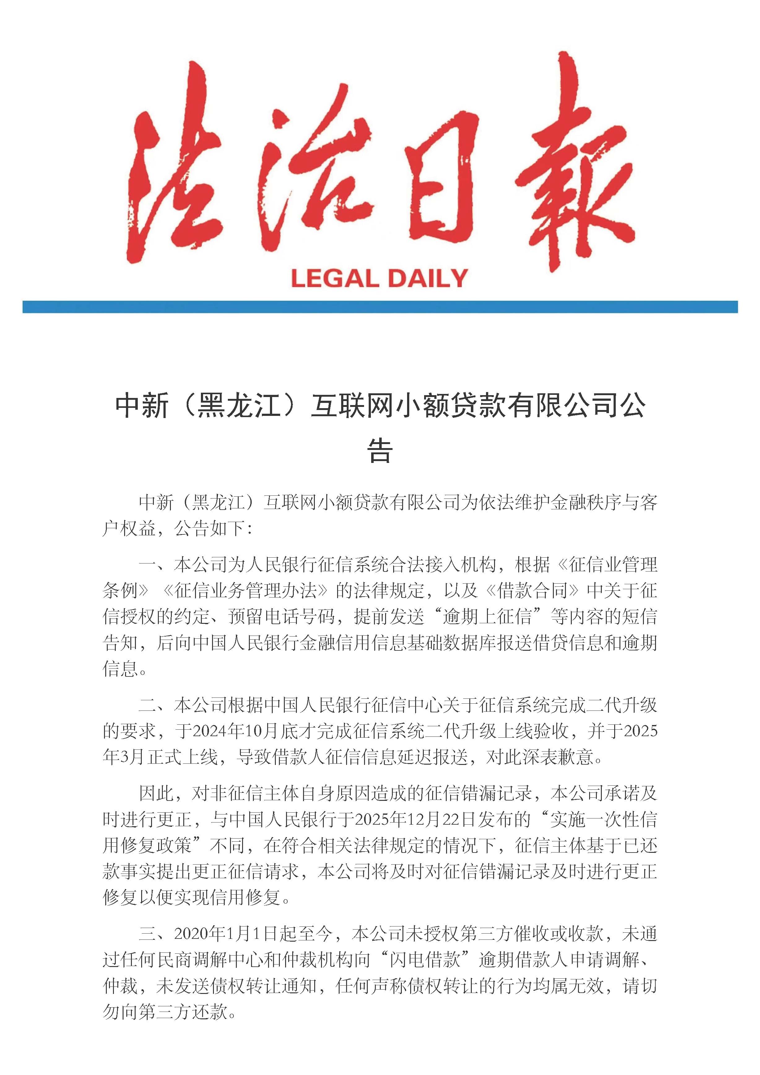 【转发机构公告】中新(黑龙江)互联网小额贷款有限公司公告